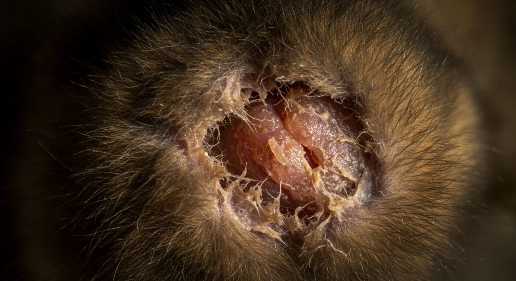 これが一番分かりやすいサインかもしれません。腫瘍があった場所から、じわっと血が出ている、もしくは、かさぶたのようなものが付いている場合は、破裂している可能性が高いです。